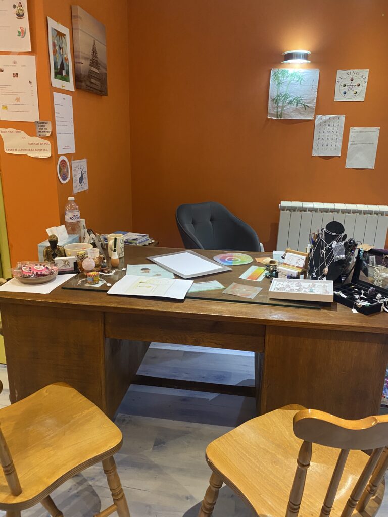 A chaque séance, les premières minutes se passent au bureau pour discuter des symptômes ressentis par le patient. Chaque séance est différente, puisque nous traitons le patient tel qu’il se présente au moment du rendez-vous. Notre pratique étant holistique, il est important que le patient soit libre de déposer son sac émotionnel, nous avons donc créé un espace où la confidentialité est primordiale. Nous avons fait le choix de définir un espace Feng Shui pour que l’Energie puisse circuler librement et aider à la détente du patient et du pracicien. Les meubles sont donc placés suivant la logique des Cinq Eléments, les couleurs ont été choisies avec la même logique.